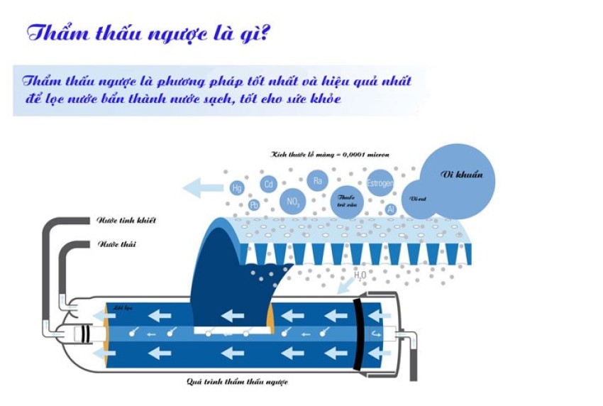 Công nghệ lọc nước RO (Reserve Osmosis) hoạt động dựa trên nguyên lý thẩm thấu ngược. Hiểu một cách đơn giản, thẩm thấu ngược là phương pháp hòa tan các chất vô cơ thông qua màng lọc RO và loại bỏ các tạp chất. Máy bơm của máy lọc tạo ra áp suất để đẩy nước qua màng RO bán thấm, loại bỏ các chất gây ô nhiễm nhỏ như ion kim loại, vi khuẩn, chất độc như asen và chất gây ung thư.