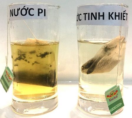 Thí nghiệm pha trà: Ly chứa nước Pi hông đun sôi (bên trái) chiết xuất ra nhiều tinh chất trà hơn, nước có màu vàng đậm, ly chứa nước tinh khiết không đun sôi (bên phải) thì dường như không ra màu.